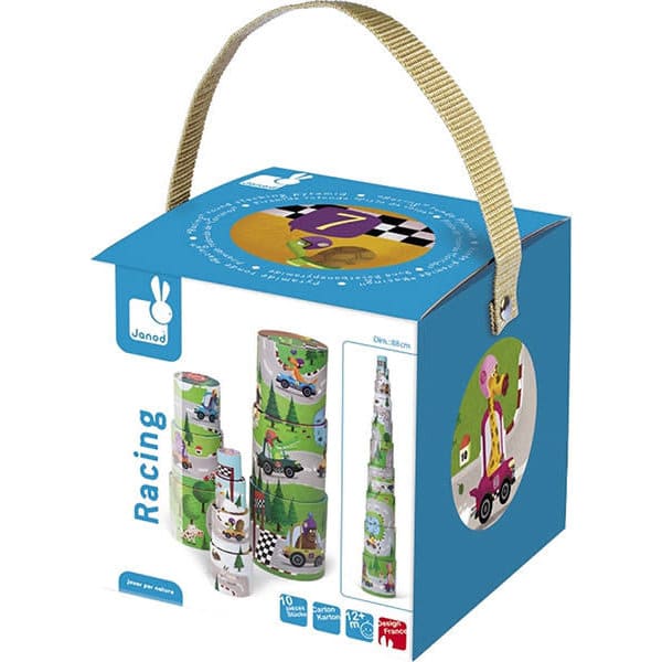 Pyramide en carton. 10 éléments empilables pour recréer une belle pyramide: chaque élément doit être positionné de façon à ce que les illustrations correspondent. Pendant que votre enfant empile les blocs, il ou elle découvre un circuit de super voitures où plusieurs concurrents courent jusqu’à l’arrivée au sommet des blocs. Il y a aussi un numéro au-dessus de chaque élément. Votre enfant utilisera cette pyramide pour apprendre à compter jusqu’à 10 et pour développer sa motricité et son imagination tout en s’amusant!