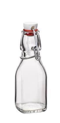 Quatre mini bouteilles en verre à couvercle basculant dans une caisse