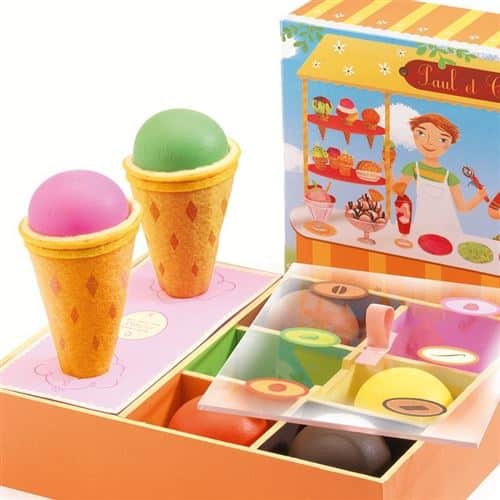 Vos propres bonbons glacés Djeco avec tous les ingrédients nécessaires à la fabrication de vos glaces, le tout dans une boîte ; la boîte sert à la fois de présentoir et de boîte de rangement.