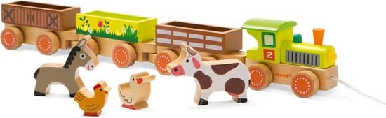 Story trein boerderij magnetisch met 4 wagons waaronder 1 locomotief en een vee wagon om dieren mee te vervoeren. Gemaakt van massief hout. Geschikt voor kinderen tussen 3 en 8 jaar.