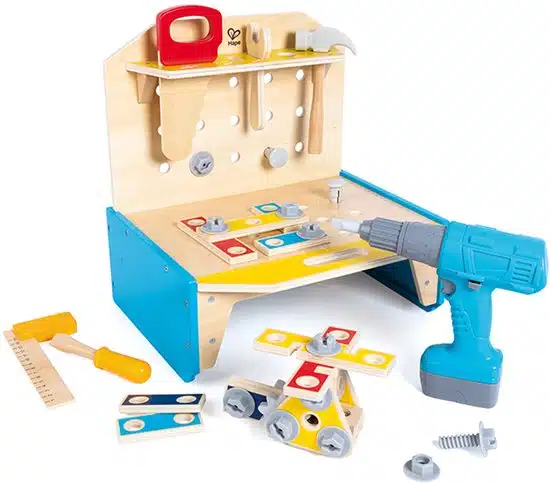 Met deze veelzijdige werkbank kunnen kinderen hun creativiteit de vrije loop laten en verschillende constructies maken. Of ze nu doen alsof ze dingen repareren of eigen ontwerpen creëren, deze werkbank biedt eindeloze mogelijkheden. Gemaakt van stevig hout, is dit speelgoed zowel duurzaam als leerzaam. Houten werkbank voor kinderen: compleet met gereedschapDe Houten werkbank voor kinderen wordt geleverd met maar liefst 51 onderdelen, waaronder een elektrische boor, hamer, zaag, meetlat, schroeven, moeren, en verschillende houten blokken.