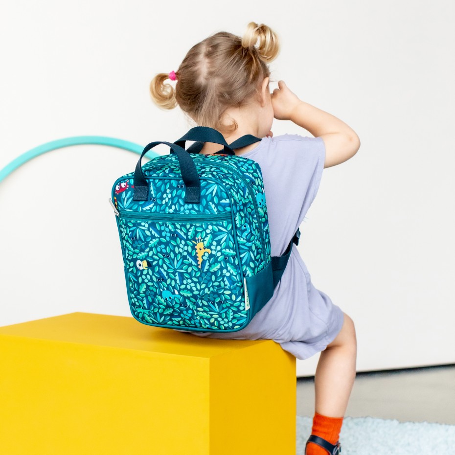 Nieuwsgierige oogjes piepen door het bladerdak van de grote jungle. Deze uiterst praktische rugzak is bedacht voor kleine ontdekkers die van elke uitstap een groot avontuur maken. Gemaakt van gerecycleerd PET-materiaal.