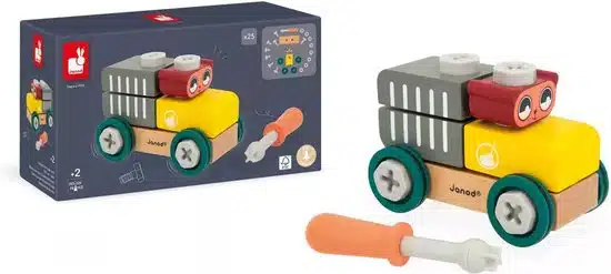 Kleine beer is klaar voor een praktische ervaring! Deze bouw-je-eigen houten auto helpt kinderen vanaf 3 jaar hun verbeelding en fijne motoriek te ontwikkelen door de stukken in elkaar te zetten voordat ze wegracen! Dit bouwspel bestaat uit 9 houten stukken en 14 plastic hardware-elementen (schroeven, moeren en inzetstukken).