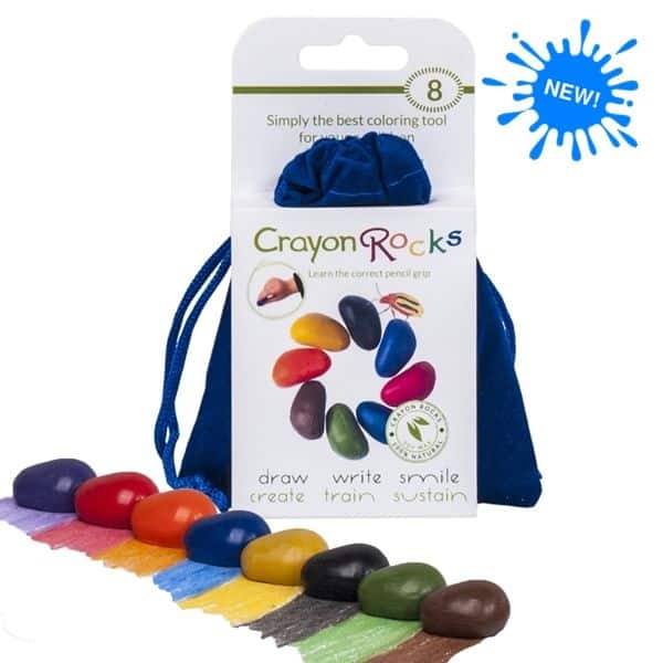 Blauw zakje van velours met daarin 8 wasco krijtjes in de vorm van een kiezelsteen. Met ergonomische grip!