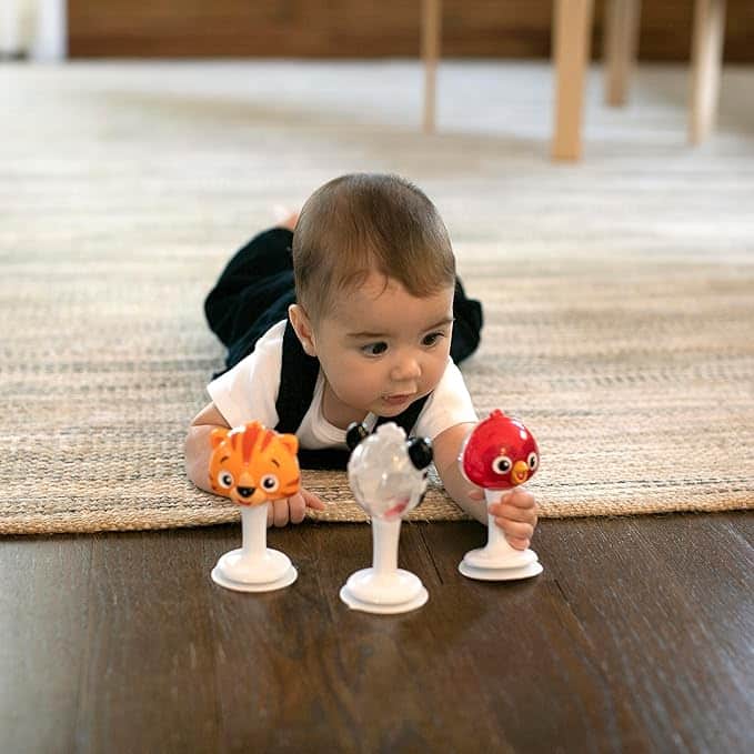 Voeg meer jingles toe aan etenstijd, autoritten of speeltijd thuis met het Rattle & Jingle Trio van Baby Einstein. Met zuignapvoetjes blijven deze muzikale rammelaars goed zitten op vlakke oppervlakken zoals tafels en kinderstoelladen. Elk vriendelijk gezichtje maakt een ander geluid om je kleintje te vermaken. Dankzij de transparante achterkant zal je baby zich graag concentreren op het geluid dat binnenin wordt gemaakt. Introduceer oorzaak-en-gevolgplezier met een tafelspeeltje dat gemakkelijk vast te pakken en mee te nemen is!