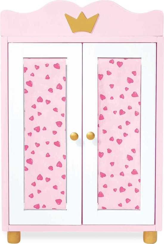 Deze poppenkleerkast is gemaakt van massief den en is wit en roze gelakt. Deze kast is versierd met een gouden kroontje. Nu kunnen de poppen in dezelfde kamer slapen als uw kinderen. Deze poppenkleerkast omvat een kledingroede en 3 kleine kapstokjes. De afmetingen zijn 45 cm breed, 25 cm diep en 68 cm hoog.