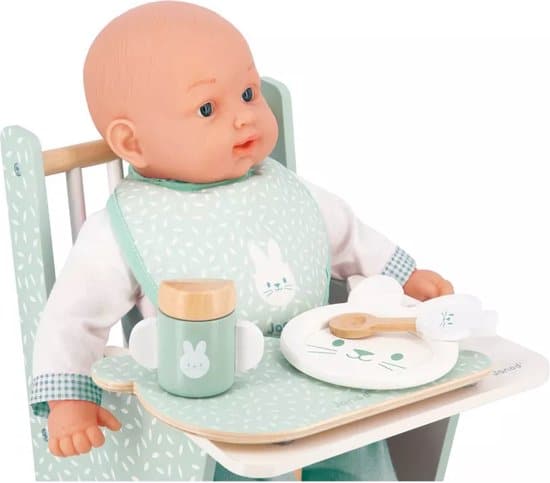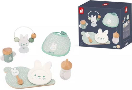 De ‘Set Poupon Zen’ van het Franse merk Janod is een 7-delige speelgoedset waarmee poppenouders hun babypop kunnen verzorgen gedurende dag. Een must-have voor kinderen die graag met hun poppen of knuffels tutten en frutten. Oefen met poppen en leer door de fles te geven, een slab om te doen voor het eten of met de rammelaar te spelen. Door poppen al spelend te verzorgen, ontwikkelen kinderen zowel hun fantasie als de fijne motoriek. Inhoud: – fles – slab – schaal – bord – lepel – beker – rammelaar met zuignap. Materiaal: – FSCTM-hout.