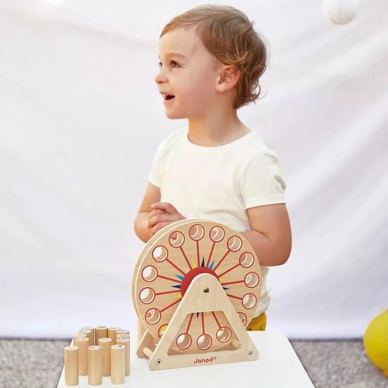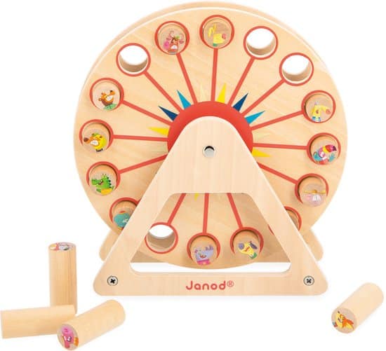 Maak je klaar om hoofden te laten omdraaien! Bedoeld voor kinderen vanaf 5 jaar: deze versie van het Nim-spel in de stijl van een houten reuzenrad is een puzzelspel voor het hele gezin. Het is het ideale spel om de concentratie en strategie van de kleintjes te verbeteren. Inbegrepen in de doos: 1 houten reuzenrad en 16 karakterstukken. Het doel van het spel is eenvoudig: verwijder elke beurt 1, 2 of 3 personages en wees de laatste speler die een personage op het reuzenrad achterlaat.