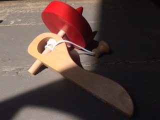 Rode houten tol met houder, gemakkelijk om te laten tollen: koord omwinden en trekken!