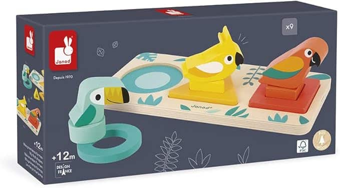 Vormspel: 3 kleurrijke vogels die de baby begeleiden bij zijn eerste leerervaringen; doel van het spel? Leg de 9 delen op de basis op de juiste plaats en in de juiste volgorde, zodat de vogels trots kunnen zitten; elk onderdeel is specifiek, zodat het kind zijn observatiegevoel tijdens het spel kan aanscherpen